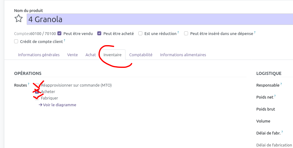 Pour que les ordres de fabrication soient lancés depuis l'outil de "groupe de ventes à produire", il faut que ce soit l'action attendue pour le produit, telle que configurée dans la fiche produit, onglet "inventaire" :