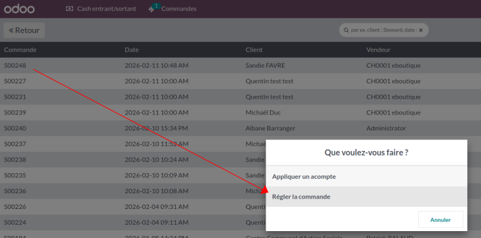 La liste des bons de commande prĂȘts sâaffiche alors : vous pouvez sĂ©lectionner celui du client en question, puis sur "rĂ©gler la commande" :