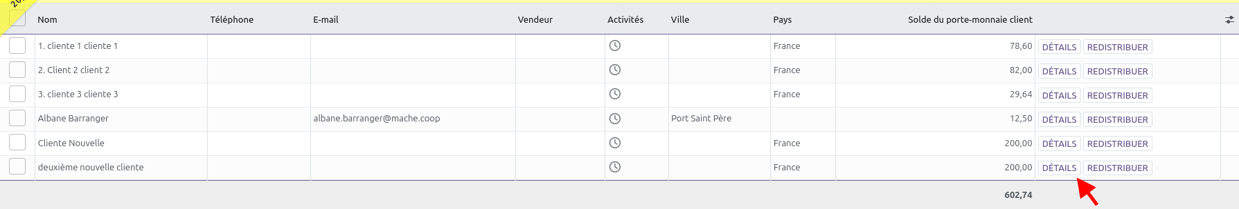 On trouve ici la liste des client.e.s avec un porte-monnaie. On peut cliquer sur "détails" pour consulter tous les mouvements depuis le démarrage du porte-monnaie.