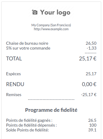 Exemple d'une carte de fidélité avec 1 point par € dépensé, et une remise de 5% sur la commande au bout de 100€
