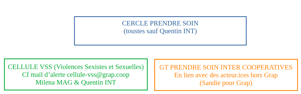 En 1ère ligne, il y a les binômes derrière les messageries d'alerte cellule-vss@grap.coop et prendresoin@grap.coop mais nous faisons le choix de donner nos mails et n° de téléphone en accès via la librairie pour que la personne souhaitant émettre un signalement de souffrance au travail puisse choisir l'interlocuteur.ice avec lequel.le elle se sent le plus en confiance.