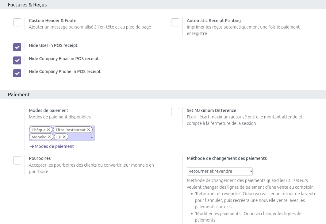 - choix des moyens de paiement acceptés :