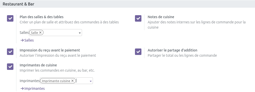 L'IOT BOX correspond au driver qui permet de faire communiquer Odoo et les périphériques de caisse (imprimante ticket, TPE, ...). L'adresse IP sera toujours celle indiquée ci-dessus : elle est obligatoire à remplir du moment qu'au moins une coche est activée. Cocher tous les éléments à connecter.