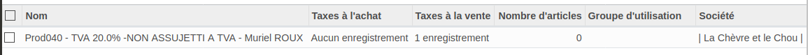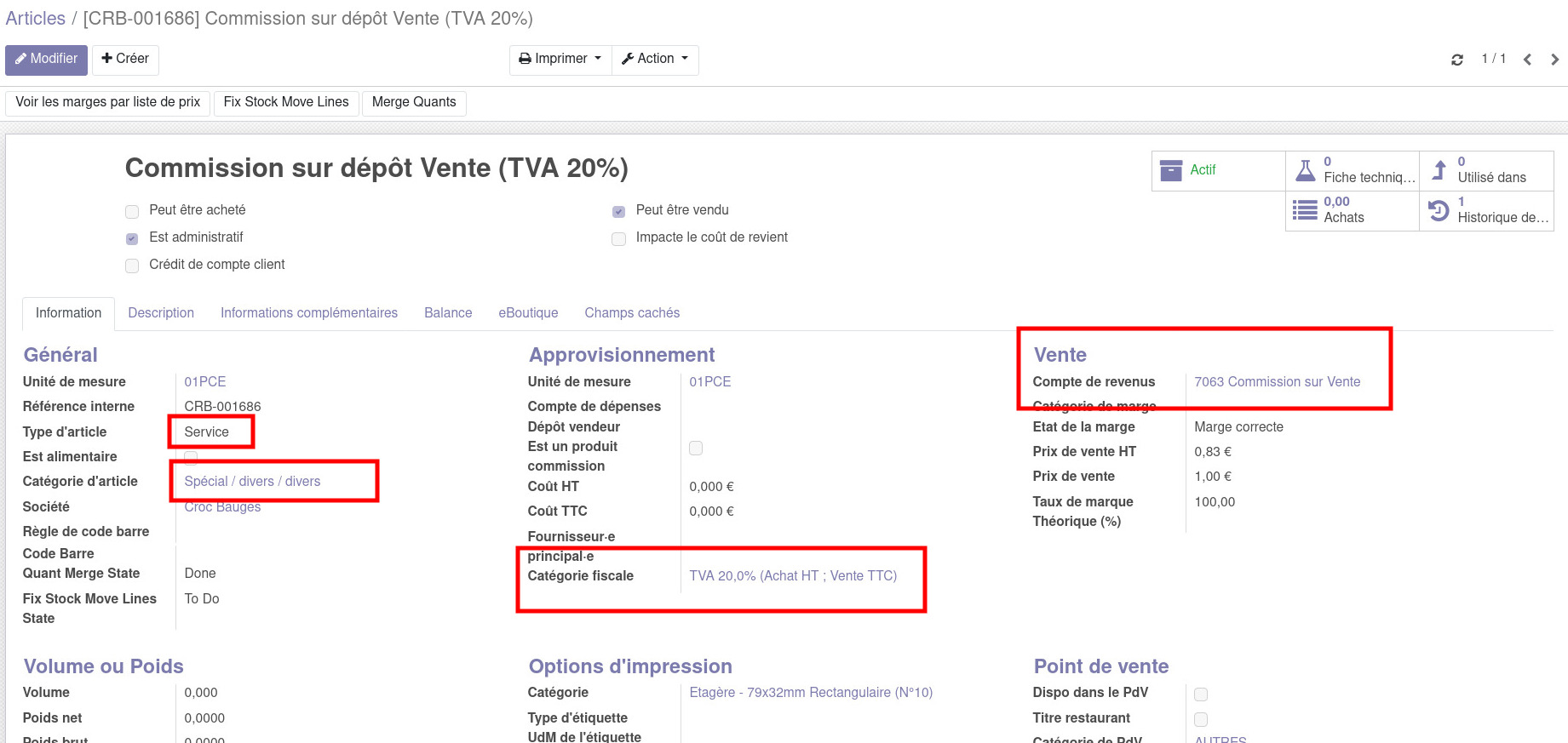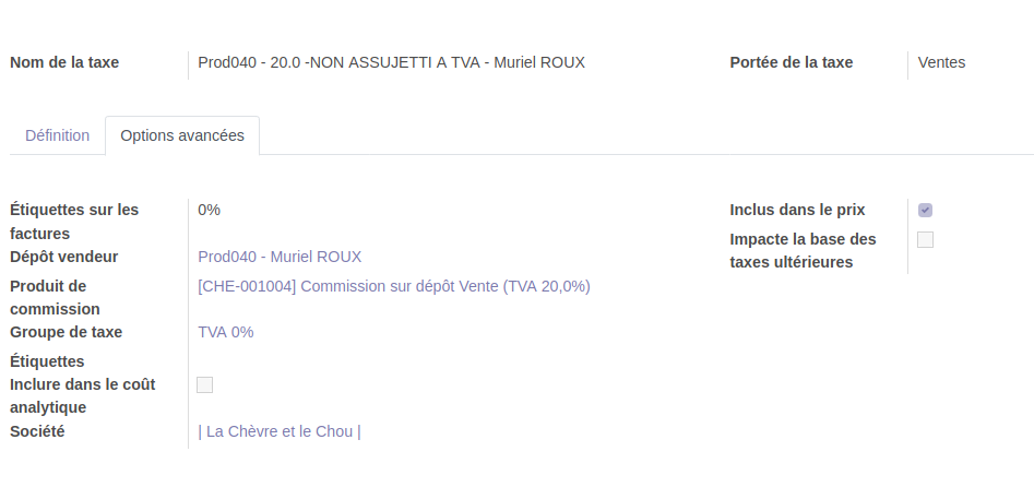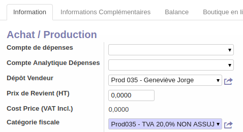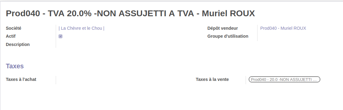 Les taxes à l'achat et taxes à la vente sont à créer au préalable (voir partie ci-dessus). Comme on n'achète pas le produit dans le cas d'un dépôt vente, "Taxes à l'achat" est nul.