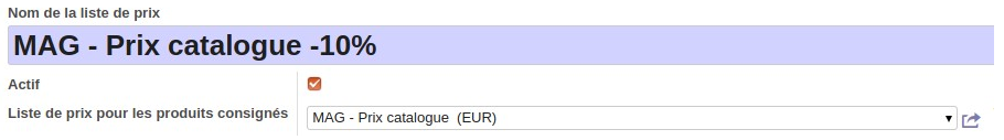 Les articles en dépôt-vente ne doivent généralement pas être soumis aux remises associées aux listes de prix. Pour que cette exception soit prise en compte, il faut utiliser la liste "Prix catalogue" pour produits consignés :