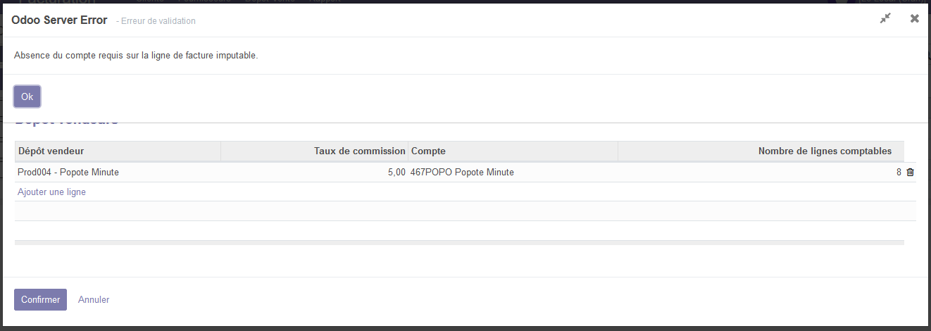 Erreur "absence du compte requis sur la ligne de facture imputable"