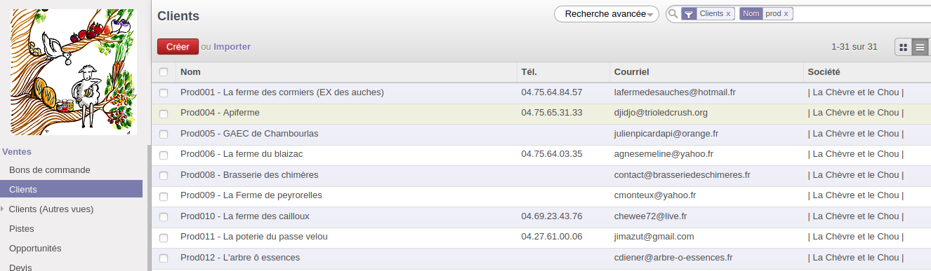Dans Ventes >> Clients, filtrer sur la liste des dépôts-vendeurs déjà paramétrés en mettant "Prod" dans la barre de filtres : en effet, le nom de chaque dépôt-vendeur devra commencer par "Prod" pour mieux les retrouver.