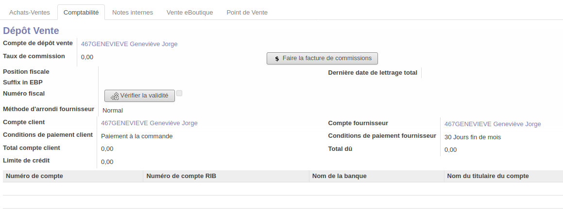 Dans l'onglet "comptabilité", le "Compte de dépôt vente" est à créer (prendre exemple sur un compte existant" :