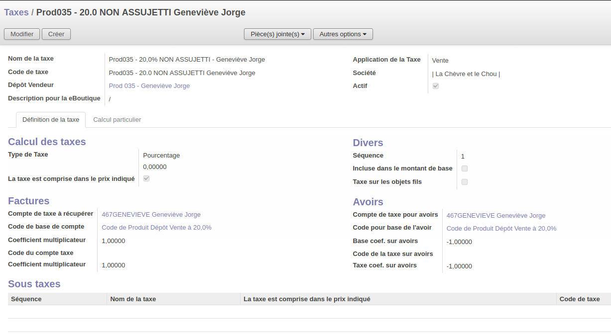 Aller dans Comptabilité >> Configuration >> Taxes >> Taxes et créer une taxe (utiliser la fonction "dupliquer" pour reprendre une fiche existante).