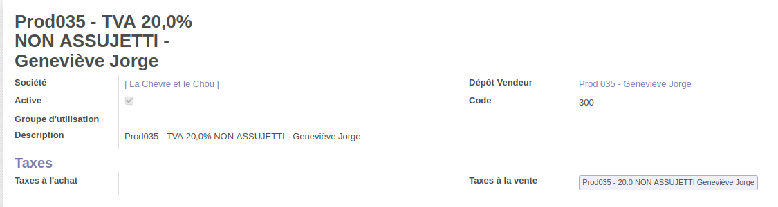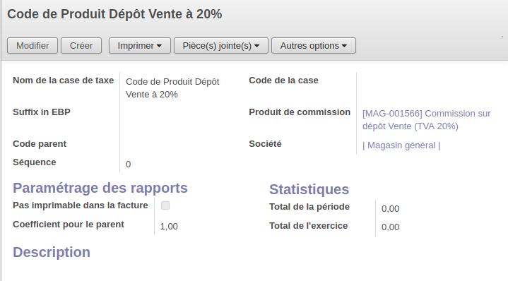 Les taxes à l'achat et taxes à la vente sont à créer au préalable (voir partie ci-dessus). Comme on n'achète pas le produit dans le cas d'un dépôt vente, "Taxes à l'achat" est nul.