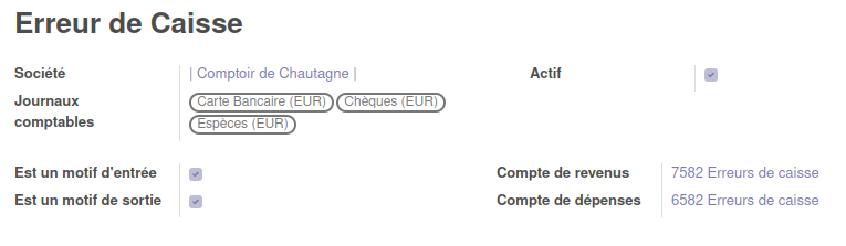 Aller également dans Point de vente >> Configuration >> Motifs de mouvement d'argent créer les mouvements suivants :