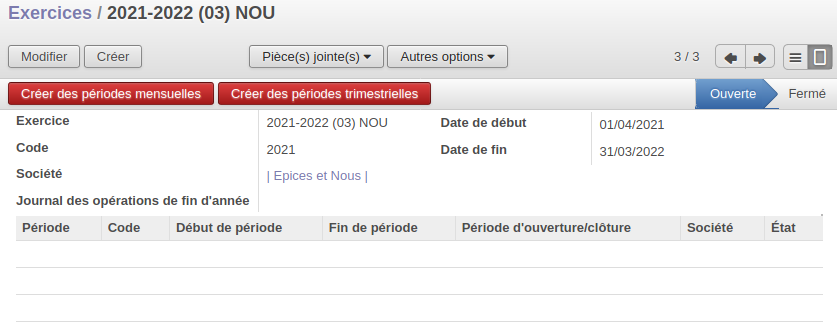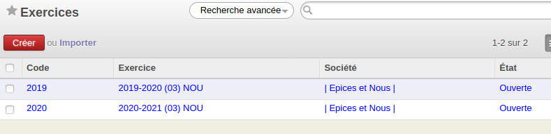 Dans Comptabilité >> Configuration >> Périodes >> Exercices.