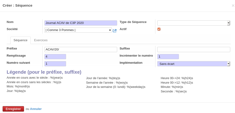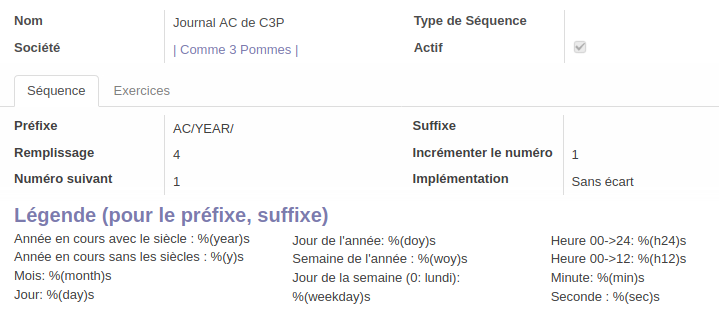 L'onglet "Séquence d'écriture" correspond à ce qu'il se passe lorsque l'onglet "Exercices" ne couvre pas la période en cours : ci-dessous, comprendre que la séquence commencera par le suffixe "AC/YEAR", sera suivie de 4 chiffres, commençant par le numéro 1 (= 0001), et évoluant de 1 en 1. En cas de conflit (2 actions simultanées), Odoo s'assurera qu'il n'y ai pas de "trou" dans la séquence, c'est ce que signifie l'implémentation "Sans écart".