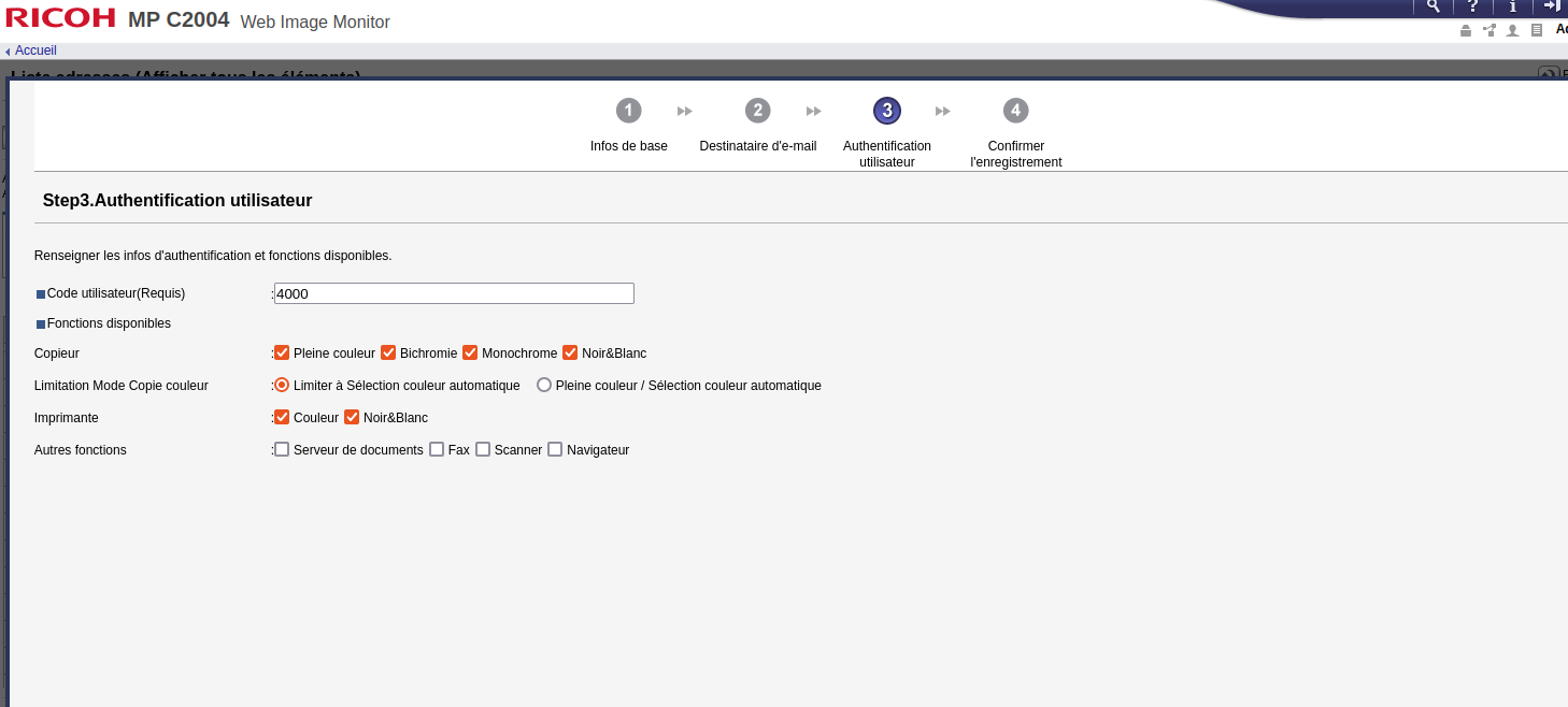 • si ça ne fonctionne pas, essayer de mettre ce même code dans le carnet d'adresse de l'imprimante (partie "code utilisateur" : http://192.168.1.251/web/entry/fr/websys/webArch/mainFrame.cgi