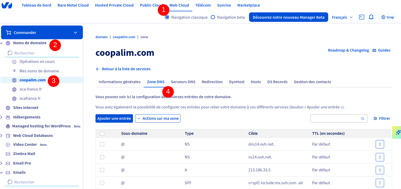 Suivre 1,2,3,4 pour arriver à l'écran de modification de la Zone DNS