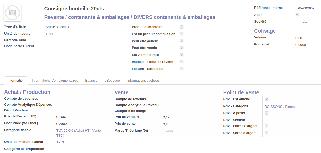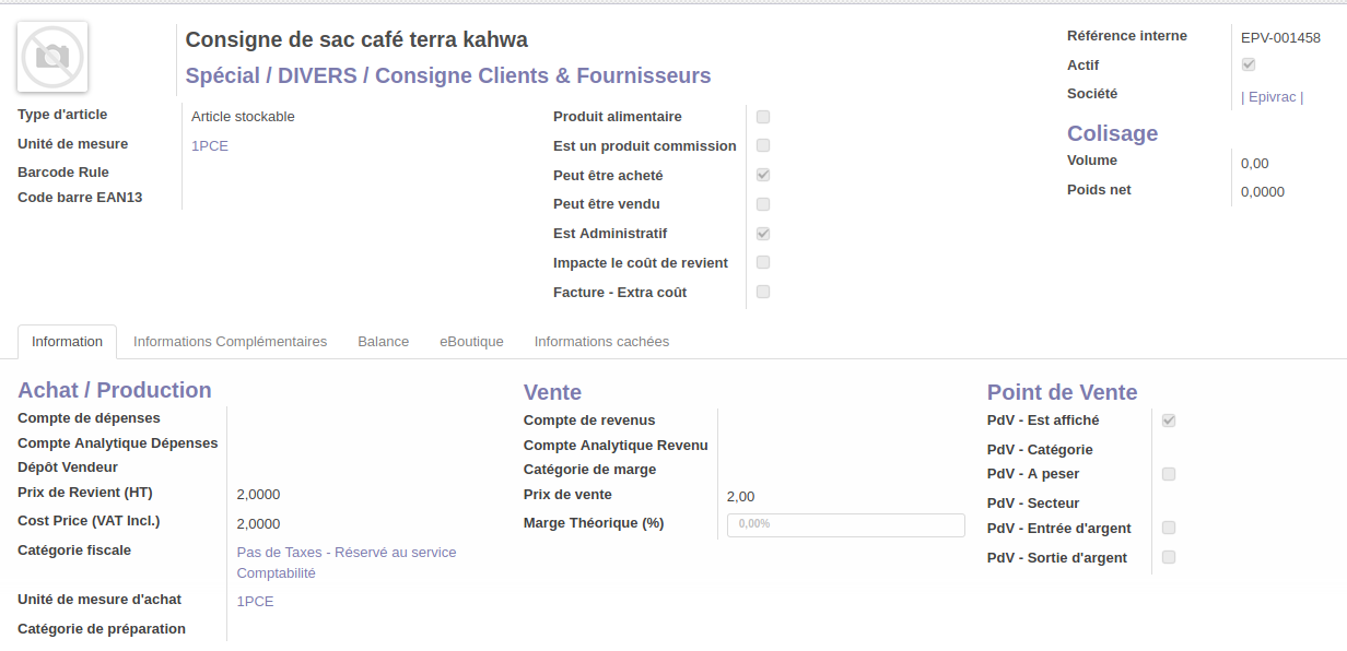 | Catégorie interne | Revente / contenants & emballages / DIVERS contenants et emballages (déjà paramétré en compte 607/707) |