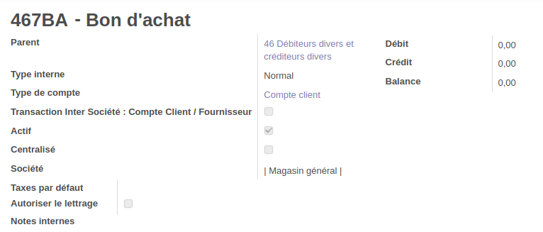 | Compte de revenus | Gérer comme un article dépôt-vendeur : 467BA Bon d'achat (Parent 46 / Normal / Produits / Actif) |