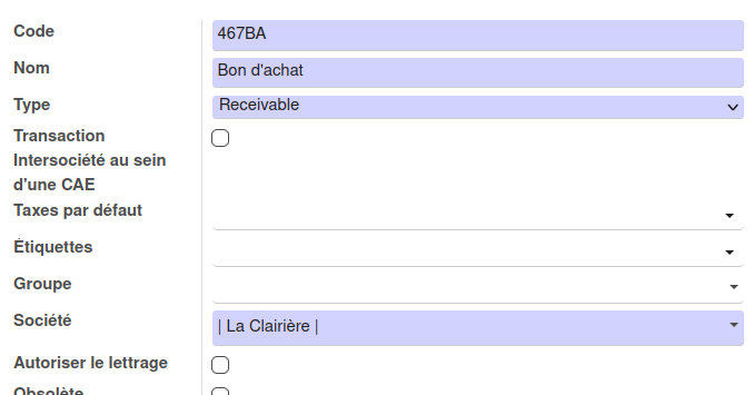 | Compte de revenus | Gérer comme un article dépôt-vendeur : 467BA Bon d'achat (Parent 46 / Normal / Produits / Actif) |