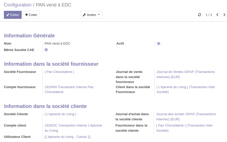 A l'enregistrement, une fiche partenaire avec "transaction inter société" dans son intitulé se créé des deux côtés.