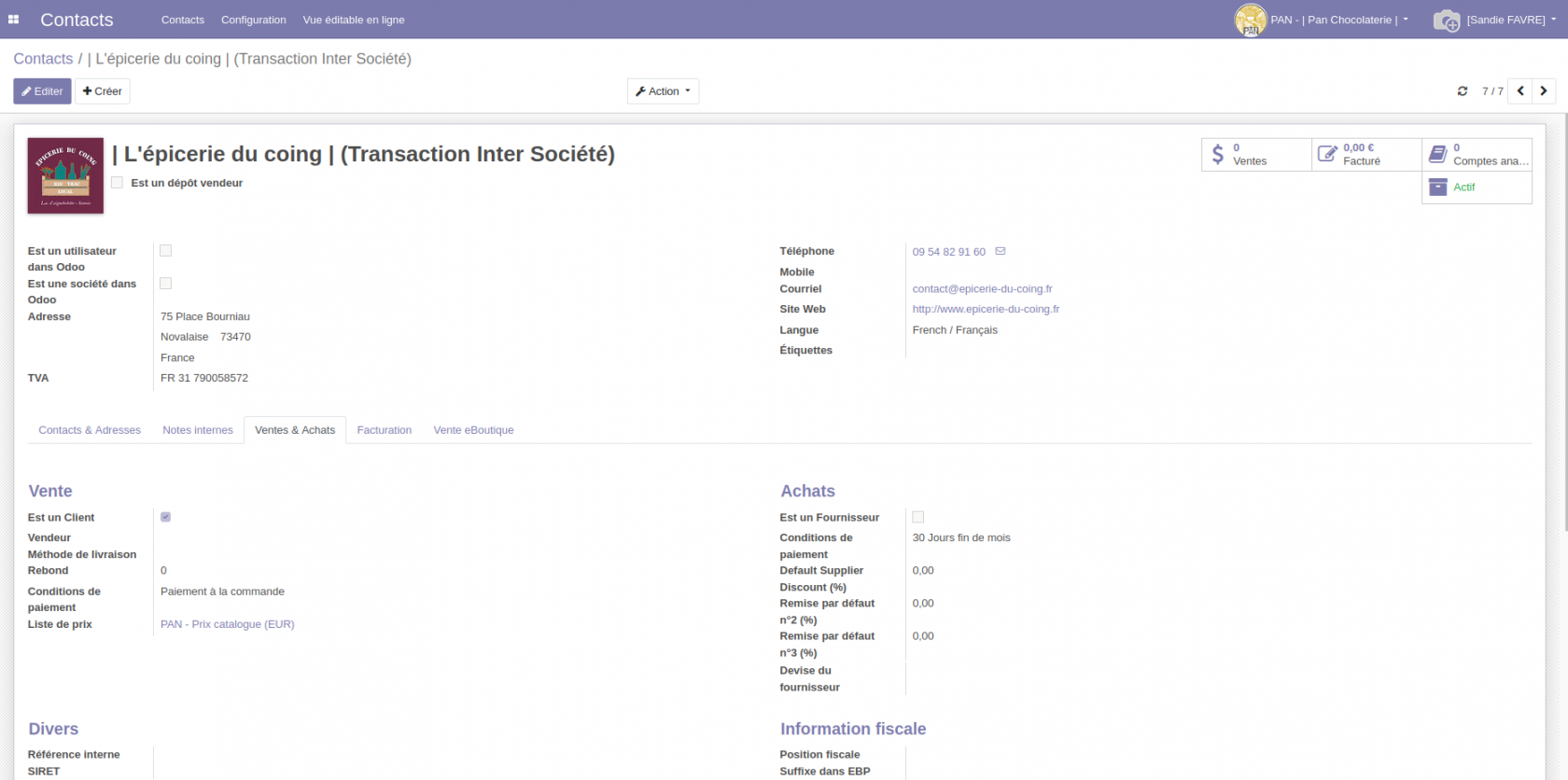 Vérifier que la "position fiscale" (partie "comptabilité") est "Client / Fournisseur Intersocité (HT)". Si le champ est vide, le compléter manuellement.