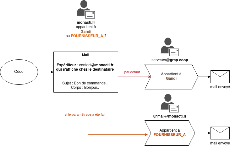 Concrètement, sur le schéma, que l'adresse affiché de l'expédieur monacti.fr soit géré par le même fournisseur que le paramétrage de la boîte mail qui envoie (Gandi ou FOURNISSEUR_A).