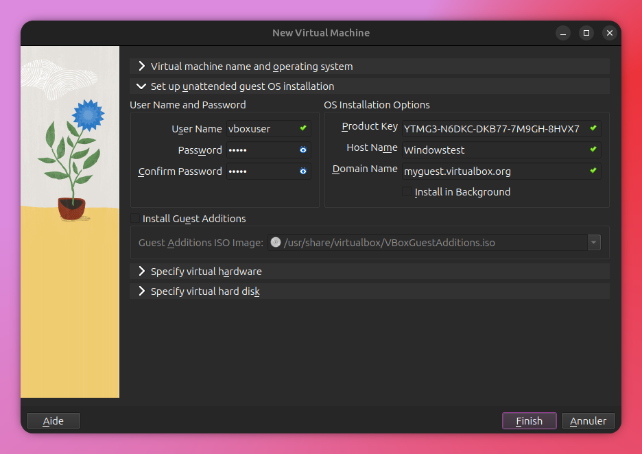 Dans l'onglet suivant, il faut choisir un nom d'utilisateur ainsi qu'un mot de passe admin. On a également besoin d'une clé produit pour installer Windows, pas besoin de s'embêter on peut trouver une clé générique >ICI<