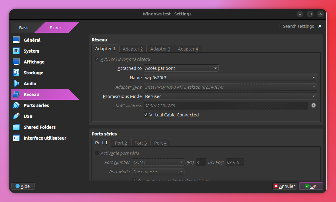 Une fois l'installation terminée on a quelques paramètres à modifier dans Windows et dans VirtualBox.