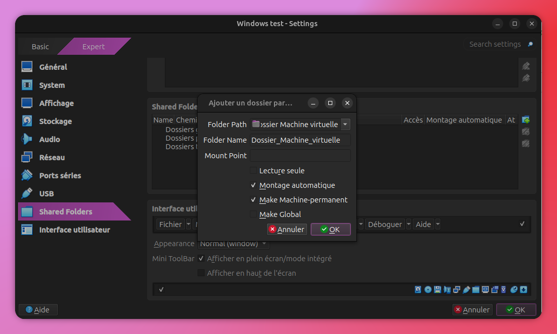 Choisir le dossier qui sera le dossier partagé et cocher les paramètres comme suit, cela permettra que le volume soit monté au démarrage de la machine et qu'il soit lié à cette machine virtuelle :