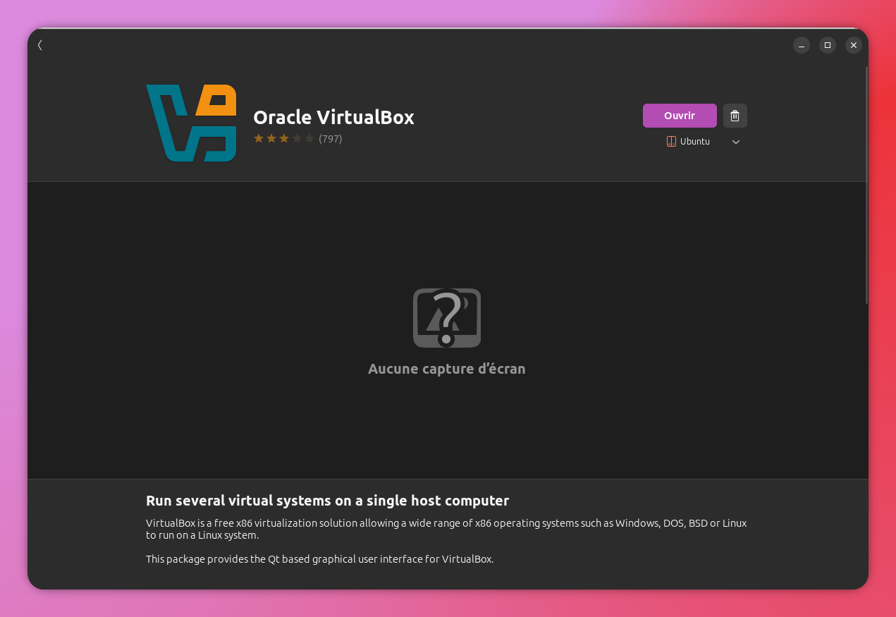 Dans le store d'application, chercher VirtualBox et l'installer. Si version foireuse, privilégier le dépôt debian à télécharger directement chez Oracle >ICI<.