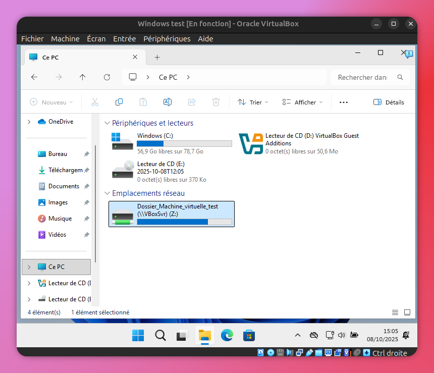 Le dossier apparaît bien sur la machine virtuelle et sur la machine hôte :