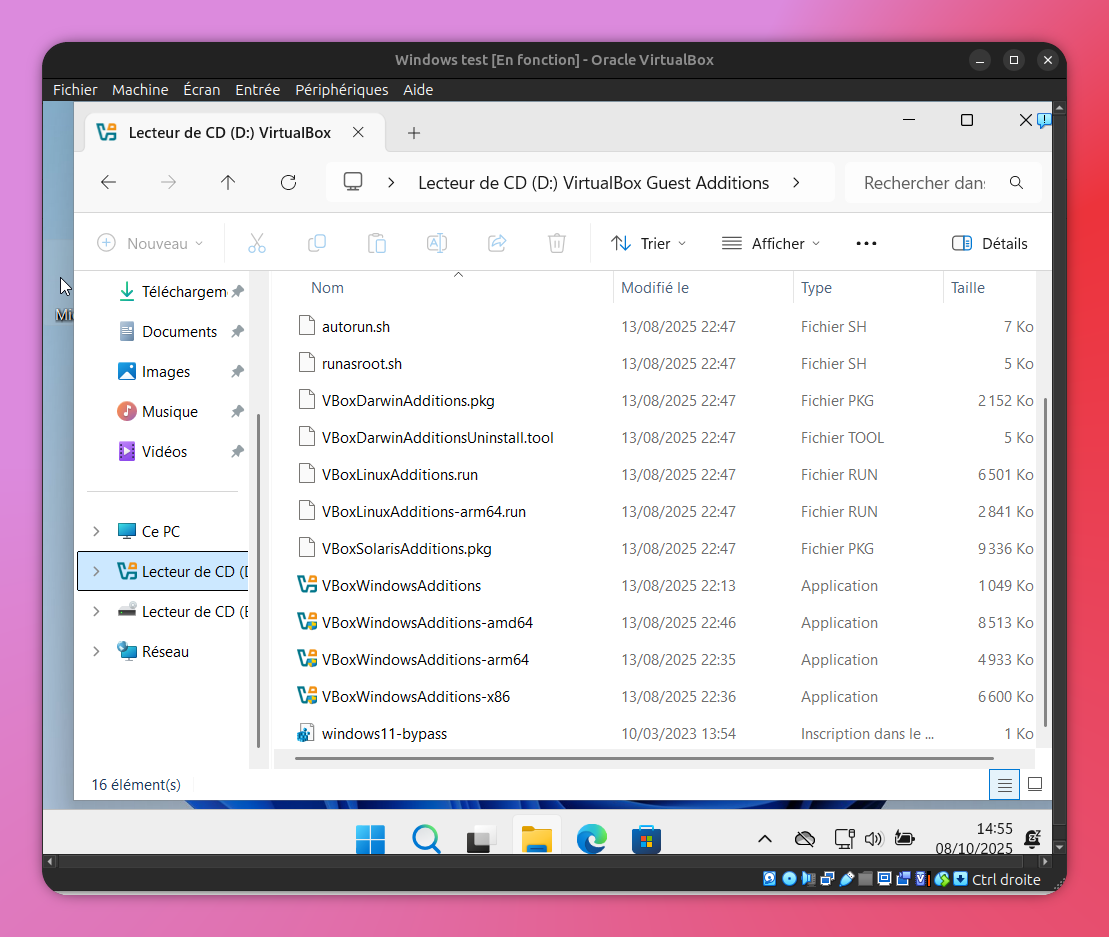 Dans VirtualBox : Périphériques>Insérer l'image CD des Additions invité... Aller dans l'explorateur puis cliquer sur le lecteur CD qui contient VirtualBox Guest Additions. Lancer l'installeur VboxWindowsAdditions. Suivre le processus d'installation et redémarrer la machine virtuelle à la fin.